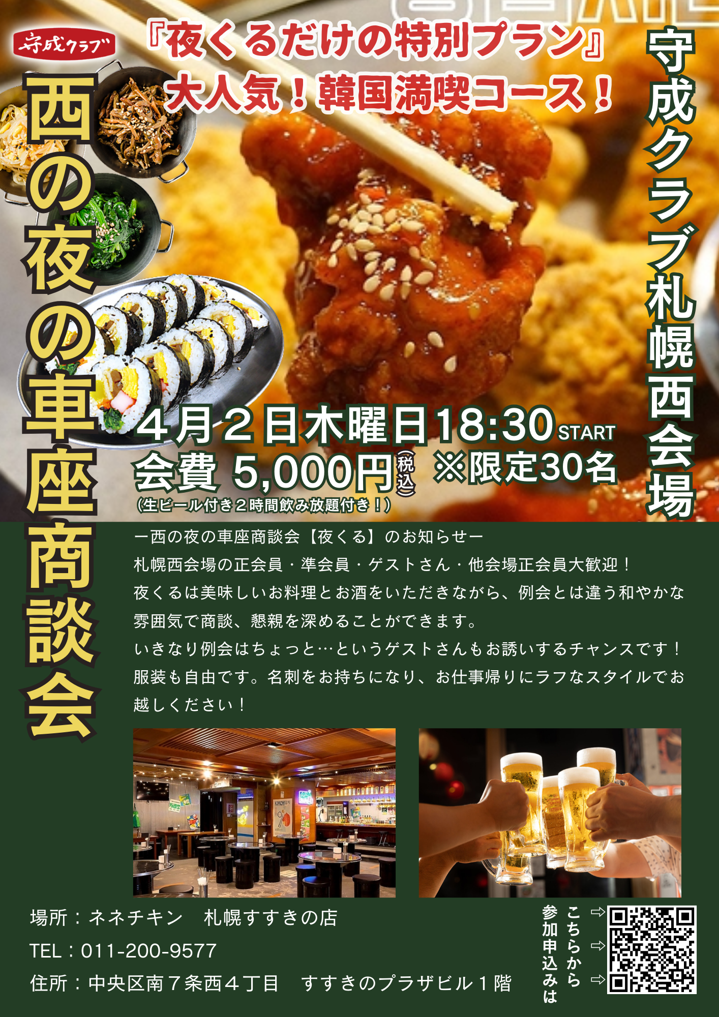 2026年4月15日(水)に開催いたします「札幌西会場 4月例会」の会場が変更になりますのでお知らせいたします。